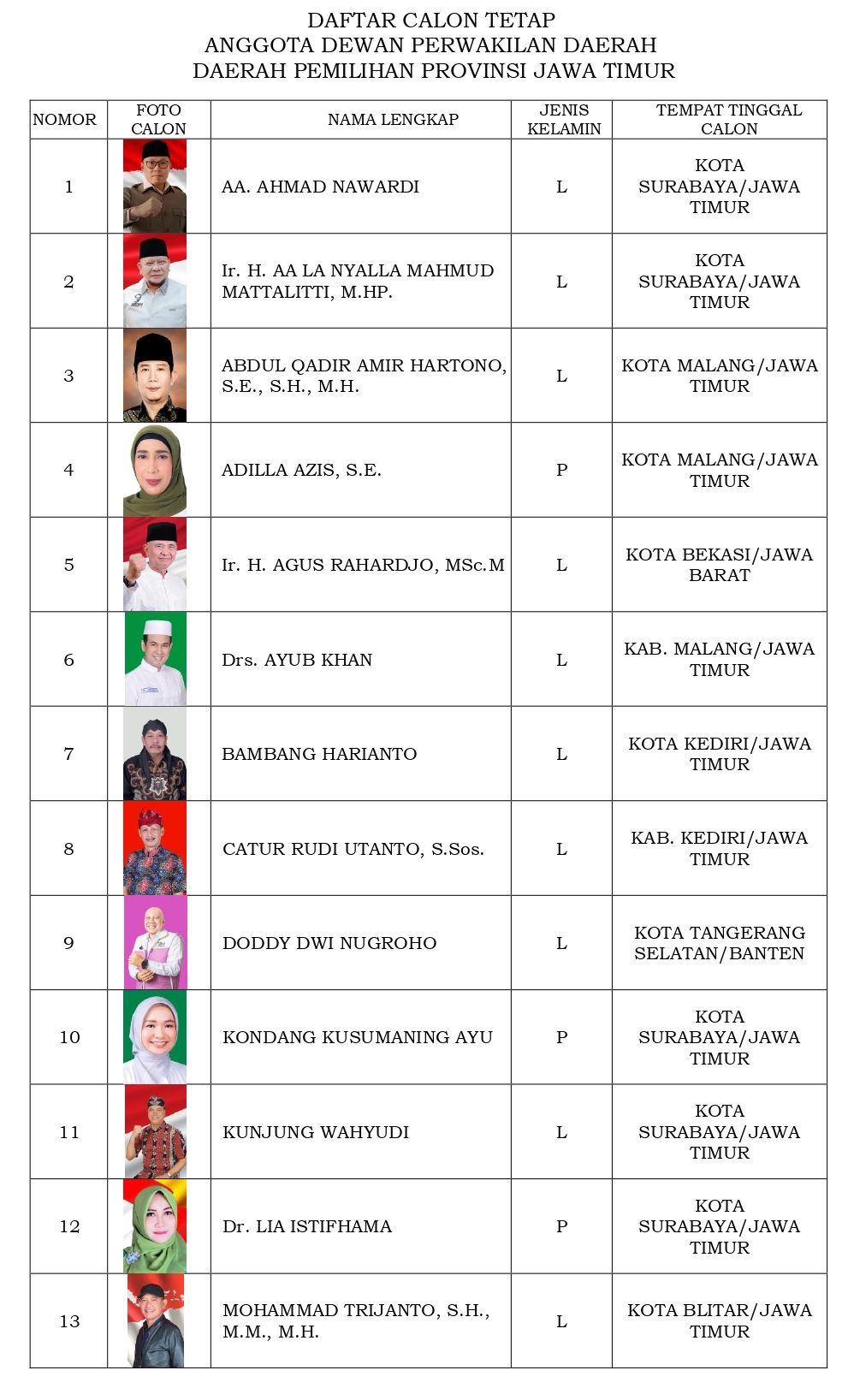 IDEALOKA.COM – Komisi Pemilihan Umum (KPU) Jawa Timur telah menetapkan 13 calon Anggota Dewan Perwakilan Daerah (DPD) Provinsi Jawa Timur melalui pengumuman nomor: 2142/pl.01.5-pu/35/2023 tentang Daftar Calon Tetap Anggota Dewan Perwakilan Daerah Provinsi Jawa Timur dalam Pemilihan Umum Tahun 2024.