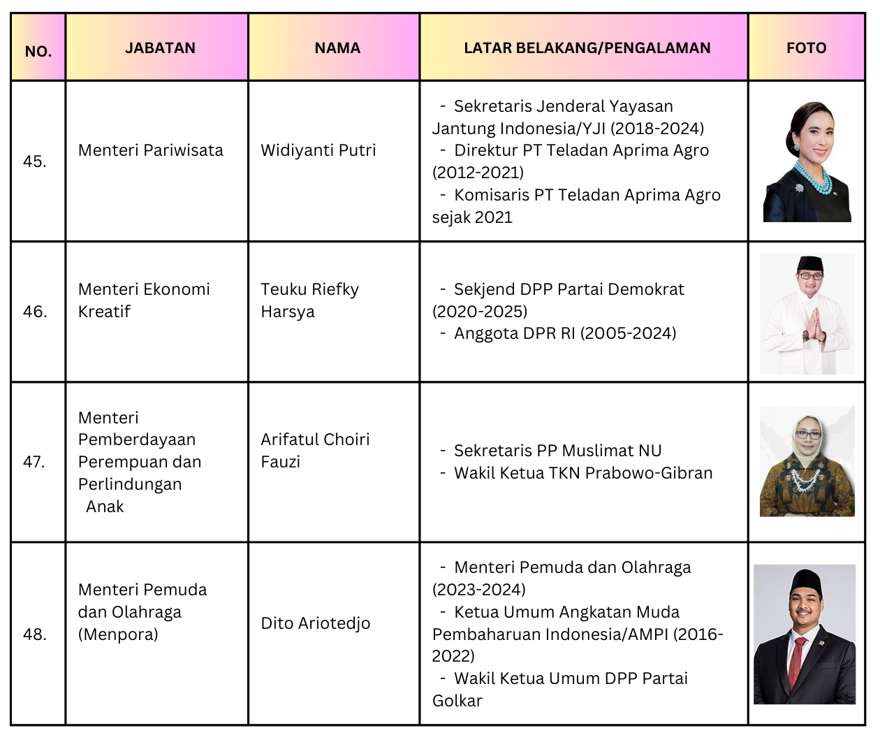 HeadlinePemerintahanPolitik Latar Belakang 48 Menteri Kabinet Merah Putih Pemerintahan Prabowo-Gibran admin20/10/202426/10/2024 Post Views: 5,892 Pages: 1 2 3 4 5